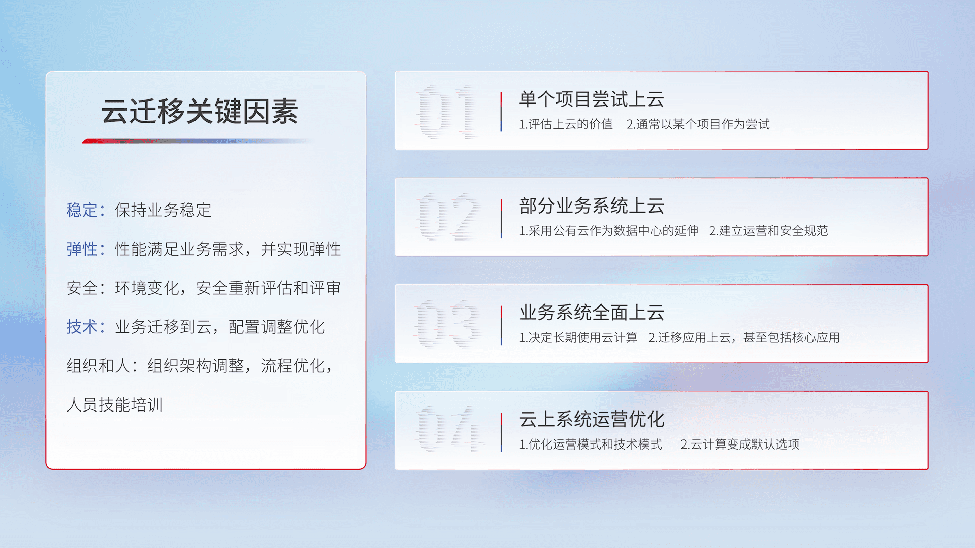 结合实际业务,,从规划设计、、云平台选型、、、云原生改造、、数据迁移、、、集成交付,,,,迁移全过程为客户识别最佳上云路径,,,,做好风险识别管理,,设计网络架构、、、、身份权限、、、、安全审计合规、、操作审计、、、、日志审计、、监控告警策略、、、、多站点容灾设计等,,对云上基础设施进行整体规划,,,提升IT治理水平,,,,以满足弹性、、高可用、、高性能的需求。。