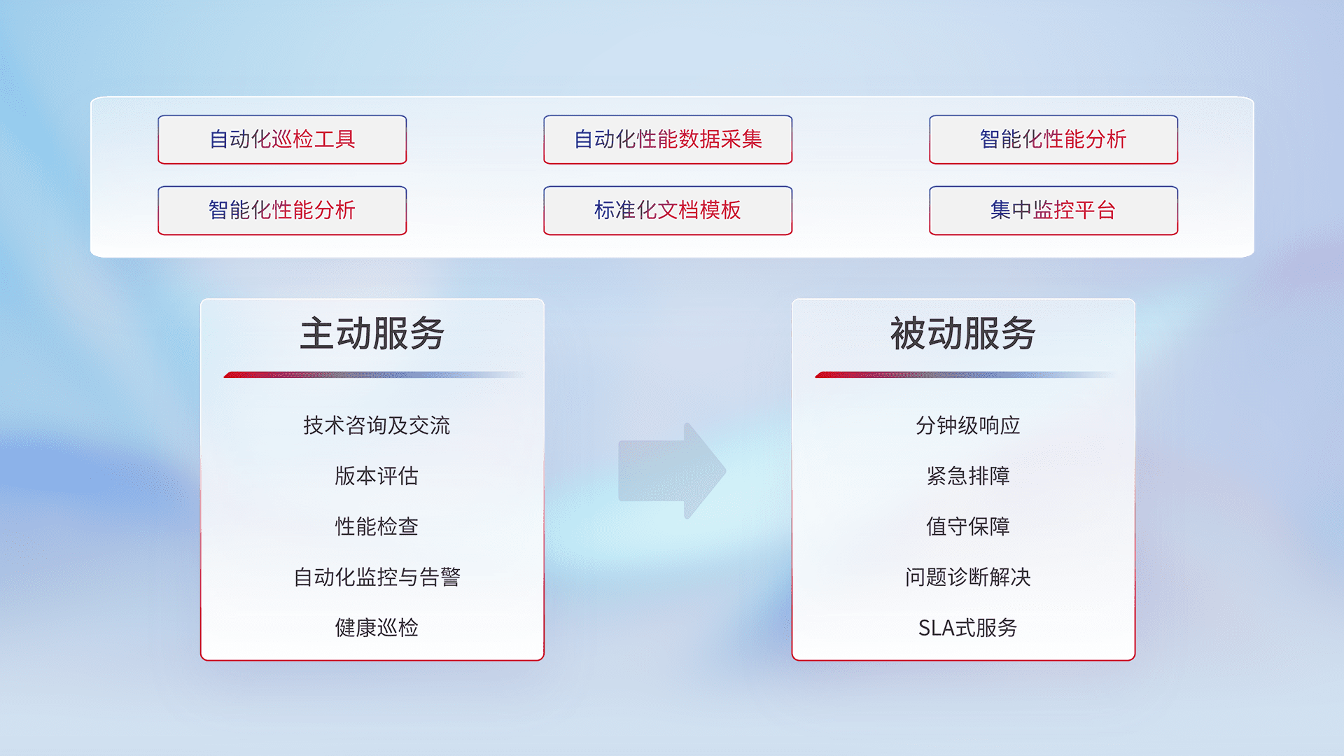 智能化工具和标准化文档,,保障服务质量,,,提供主动服务(包含技术咨询、、、版本评估、、、、性能检查、、自动化监控与告警、、、健康巡检)和被动服务包含(分钟级响应、、、、紧急排障、、值守保障、、、问题诊断解决、、SLA服务)。。。。