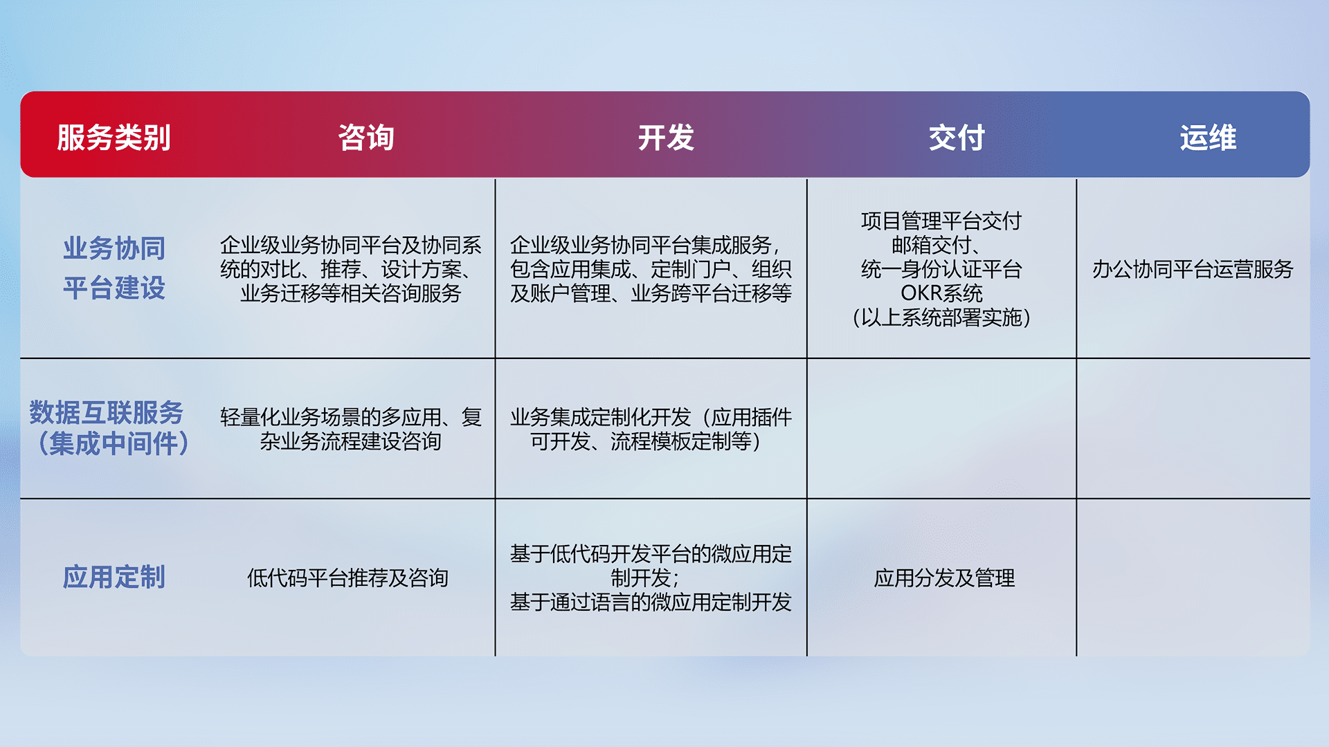 针对钉钉、、企微、、、IDaas等平台级产品提供产品的规划、、方案、、交付、、、、定制化开发等服务,,,,实现如统一协同办公、、智能客户服务、、、、混合会议管理、、智能数据查询、、、、等业务场景,,,,实现数字化转型。。。